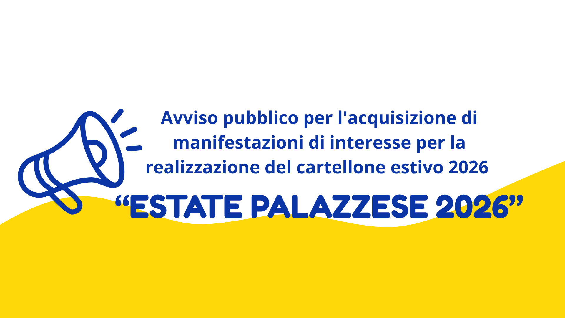 Aggiornata il - 15/04/2026 Pubblicata il - 15/04/2026 Avviso pubblico per l'acquisizione di manifestazioni di interesse per la realizzazione del cartellone estivo 2026 - "ESTATE PALAZZESE 2026" scade il 5 giugno 2026 Caricamento… cittadinoAssociazioni Text